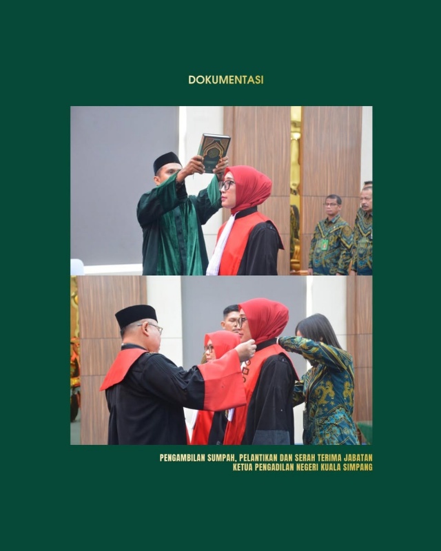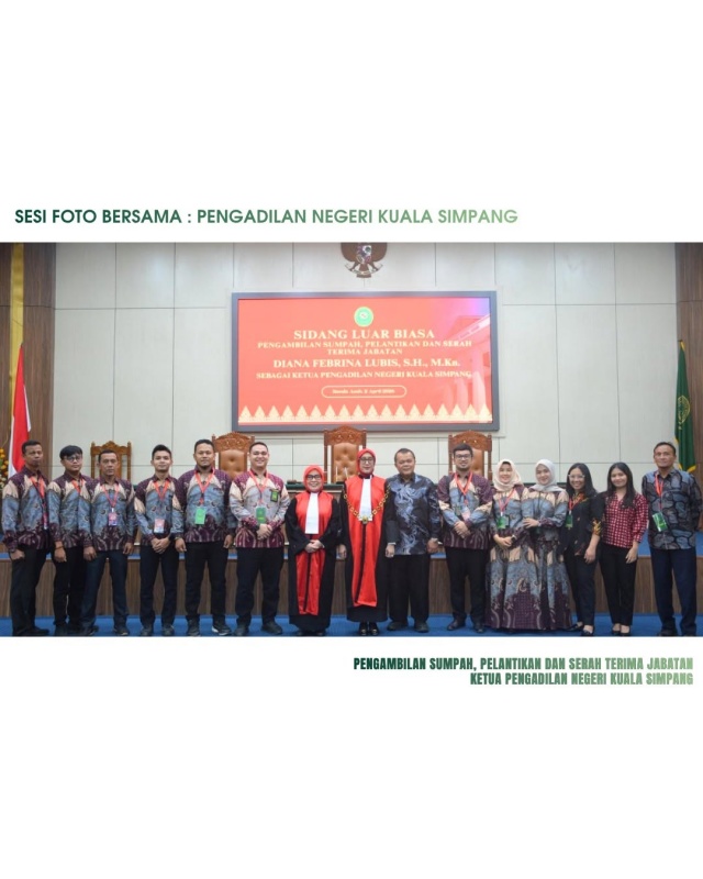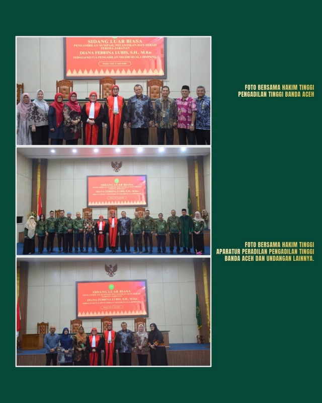 Ketua Pengadilan Tinggi Banda Aceh, Nursyam, S.H., M.Hum., secara resmi mengambil sumpah dan melantik Diana Febrina Lubis, S.H., M.Kn., sebagai Ketua Pengadilan Negeri Kuala Simpang, menggantikan Tri Syahriawani Saragih, S.H., M.H., yang mendapat promosi sebagai Hakim Pengadilan Negeri Bekasi.