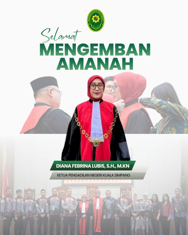 Keluarga Besar Pengadilan Negeri Kuala Simpang mengucapkan selamat mengemban amanah kepada Diana Febrina Lubis, S.H., M.Kn. sebagai Ketua Pengadilan Negeri Kuala Simpang.