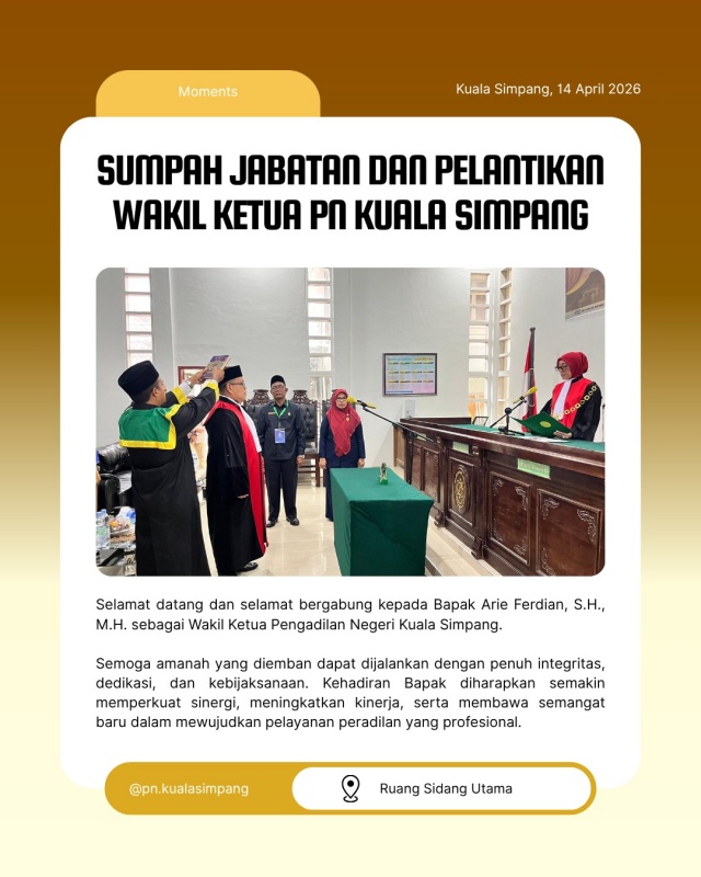 Selasa, 14 April 2026 Pengadilan Negeri Kuala Simpang melaksanakan Pelantikan dan Pengambilan Sumpah Jabatan Wakil Ketua Pengadilan Negeri Kuala Simpang. Jabatan tersebut kini diemban oleh Arie Ferdian, S.H., M.H., yang resmi dilantik dalam sebuah prosesi yang berlangsung di ruang sidang utama Pengadilan Negeri Kuala Simpang.