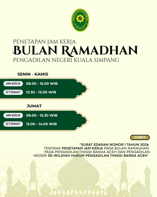 Nomor 2 Tahun 2026 tentang Penetapan Jam Kerja Pada Bulan Ramadhan di Lingkungan Mahkamah Agung dan Badan Peradilan yang Berada di Bawahnya, serta berdasarkan ketentuan Pasal 4 ayat (2), ayat (4), dan ayat (6) Peraturan Presiden Republik Indonesia Nomor 21 Tahun 2023 tentang Hari dan Jam Kerja Instansi Pemerintah dan Pegawai Aparatur Sipil Negara, dengan ini disampaikan ketentuan jam kerja selama Bulan Ramadhan sebagai berikut: