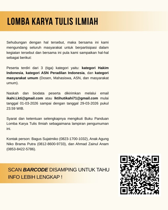 1. Peserta terdiri dari 3 (tiga) kategori yaitu: kategori Hakim Indonesia, kategori ASN Peradilan Indonesia, dan kategori masyarakat umum (Dosen, Mahasiswa, ASN, dan