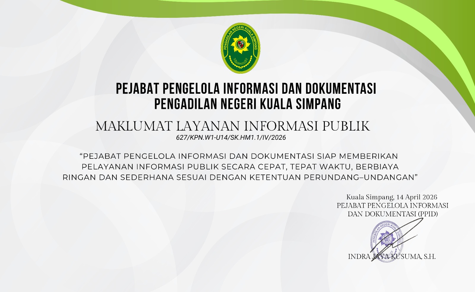 Ketua Mahkamah Agung RI pada tanggal 30 Agustus 2022 telah menerbitkan Surat Keputusan Ketua Mahkamah Agung RI Nomor 2-144/KMA/SK/VIII/2022 tentang Standar Pelayanan Informasi Publik di Pengadilan.