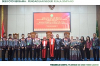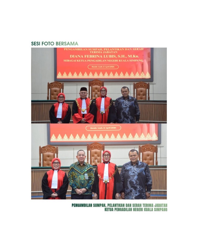 Ketua Pengadilan Tinggi Banda Aceh, Nursyam, S.H., M.Hum., secara resmi mengambil sumpah dan melantik Diana Febrina Lubis, S.H., M.Kn., sebagai Ketua Pengadilan Negeri Kuala Simpang, menggantikan Tri Syahriawani Saragih, S.H., M.H., yang mendapat promosi sebagai Hakim Pengadilan Negeri Bekasi.
